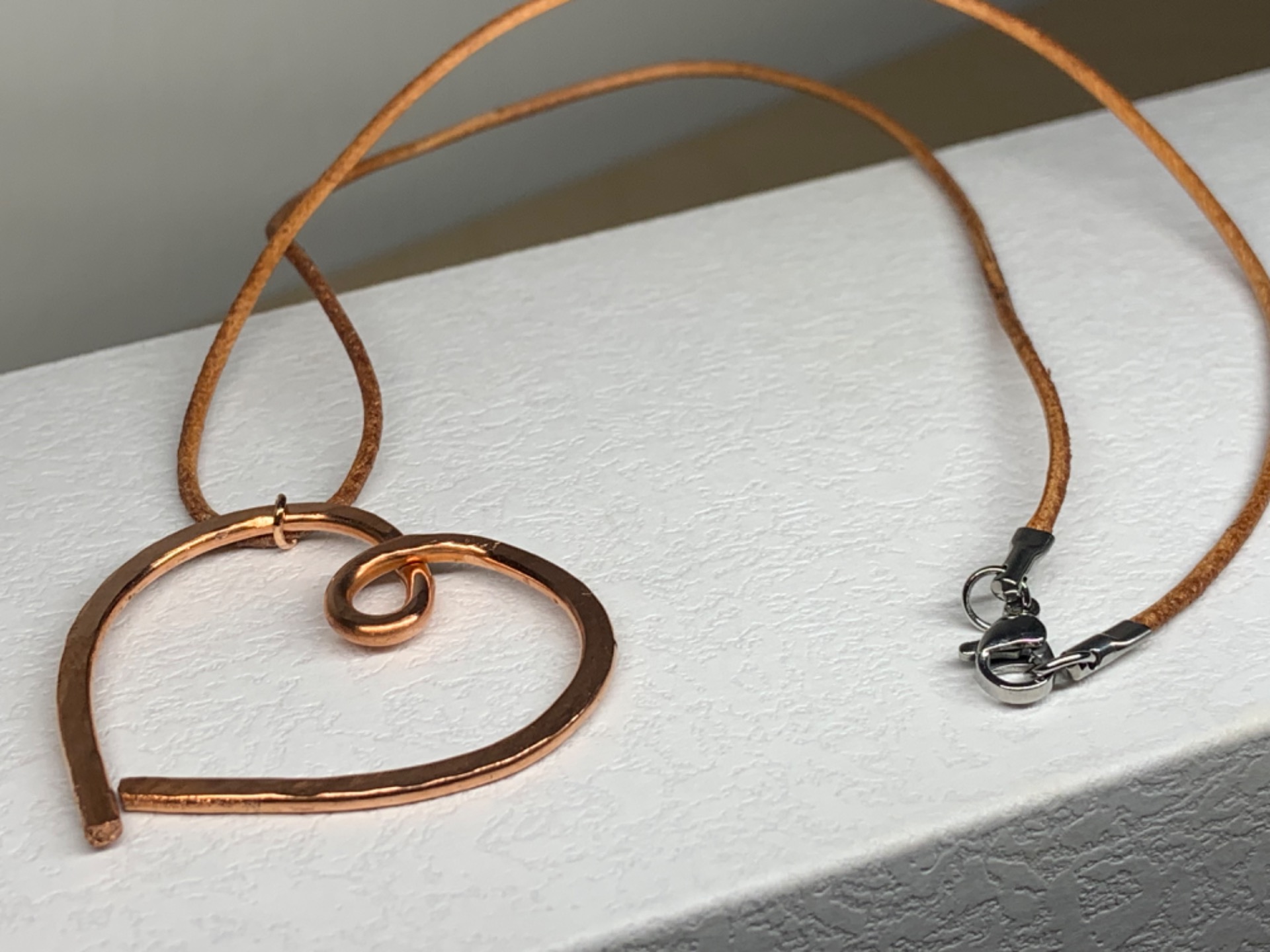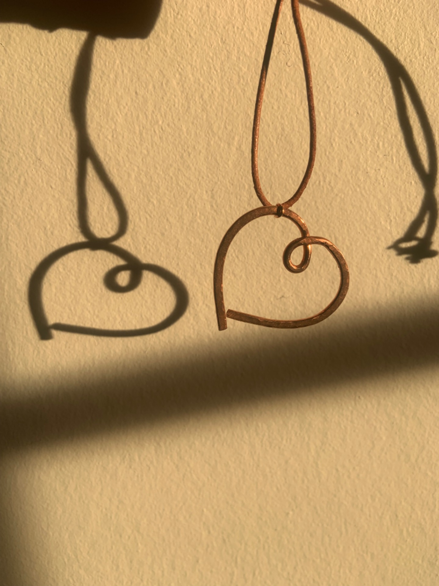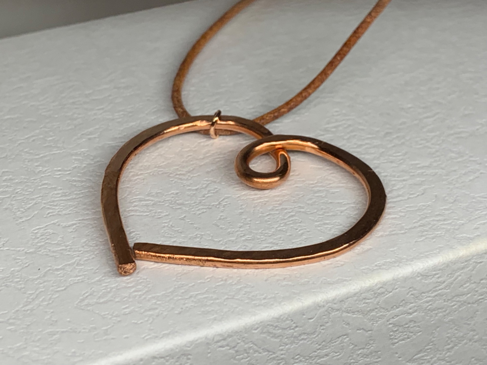 Handgehamerd hartje in massief koper. Afgewerkt met een fijn laklaagje. Dankzij deze vernislaag wordt voorkomen dat het koper of je huid groen uitslaat. Je kan ons vertellen of je een mat of shiny laklaag wil.