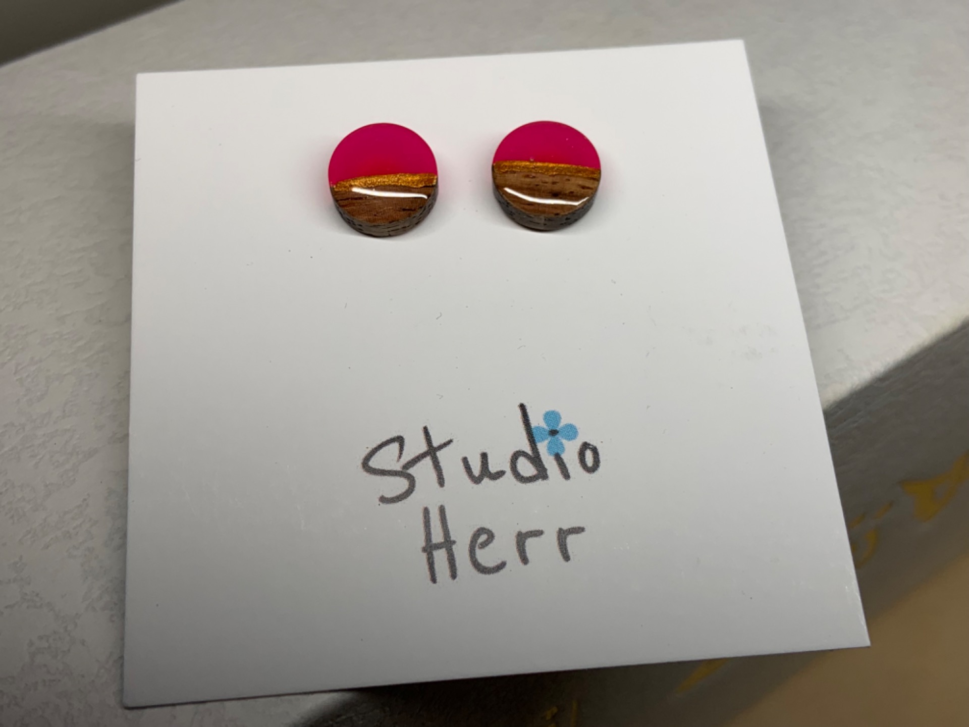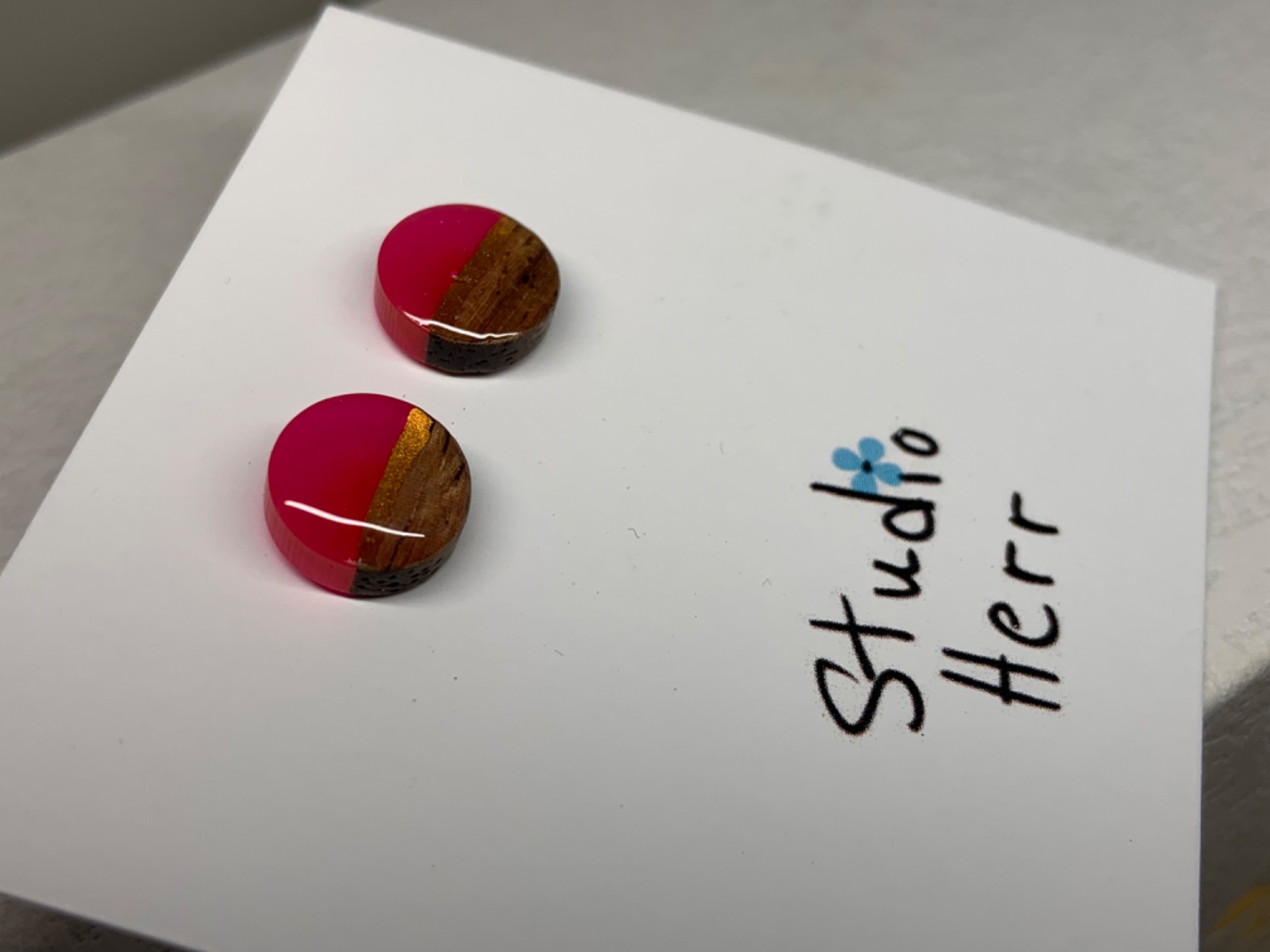 Deze massief houten korte oorbellen (notelaar) hebben aan de ene zijde een fuchsiaroze hars. We hebben deze oorbellen afgewerkt met een glanzend koperen biesje tussenin.