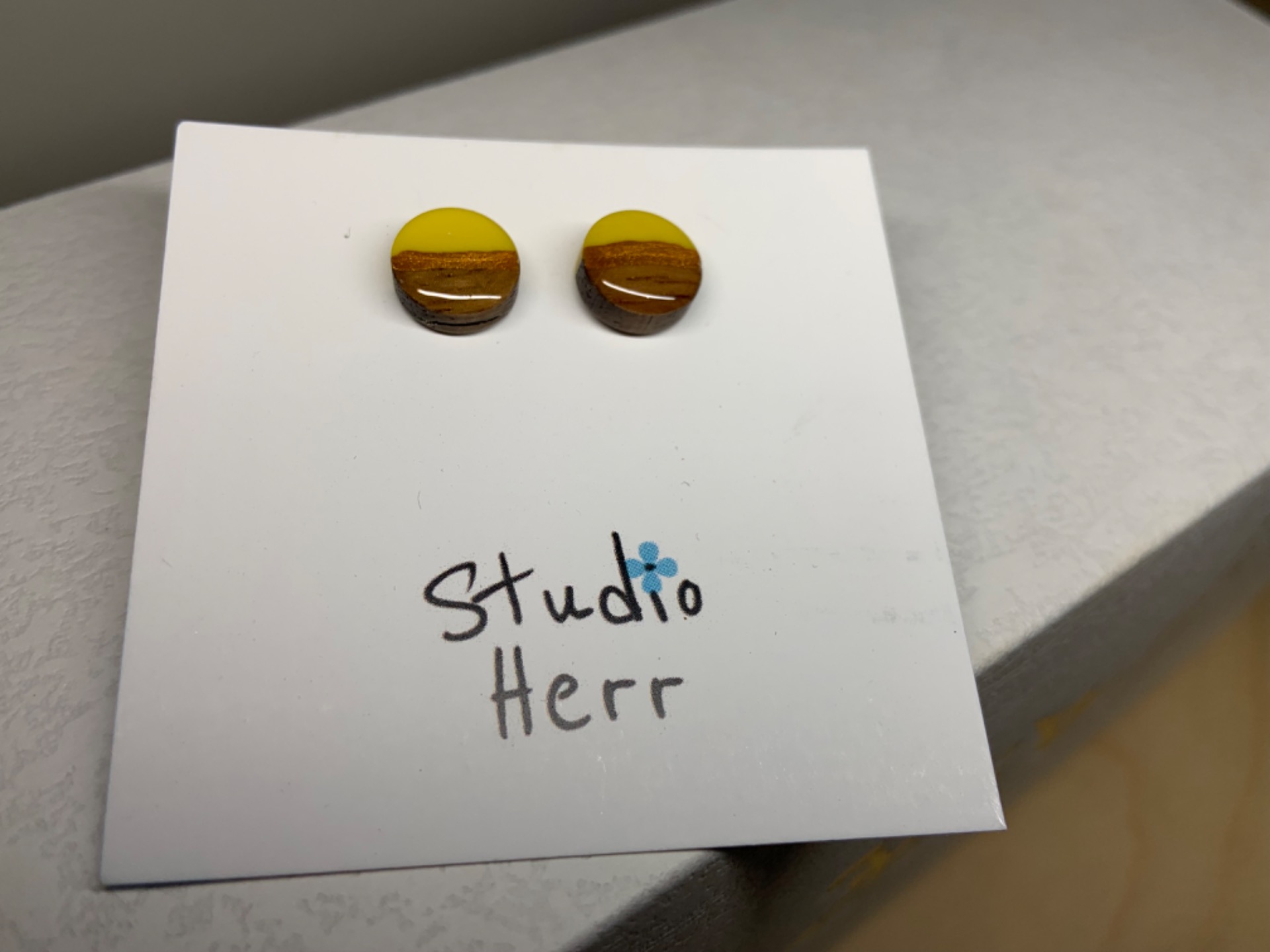 Deze massief houten korte oorbellen (notelaar) hebben aan de ene zijde een gele hars. We hebben deze oorbellen afgewerkt met een glanzend koperen biesje tussenin.