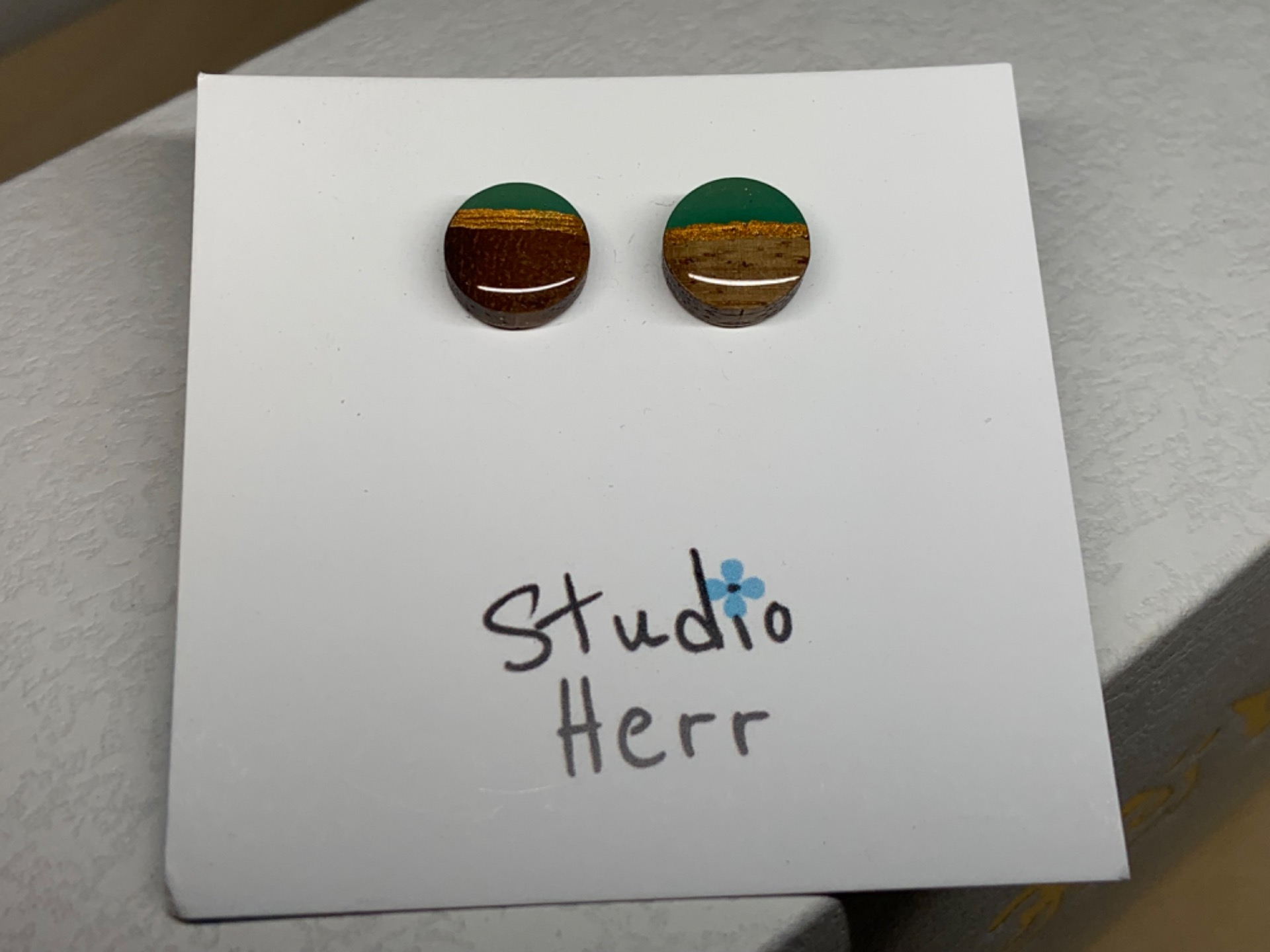 Deze massief houten korte oorbellen (notelaar) hebben aan de ene zijde een groene hars. We hebben deze oorbellen afgewerkt met een glanzend koperen biesje tussenin.