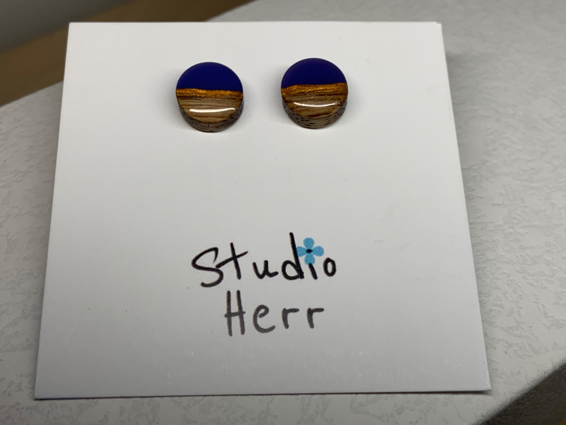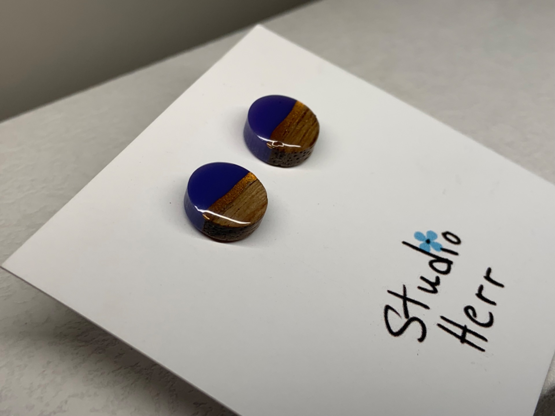 Deze massief houten korte oorbellen (notelaar) hebben aan de ene zijde een marineblauwe hars. We hebben deze oorbellen afgewerkt met een glanzend koperen biesje tussenin.