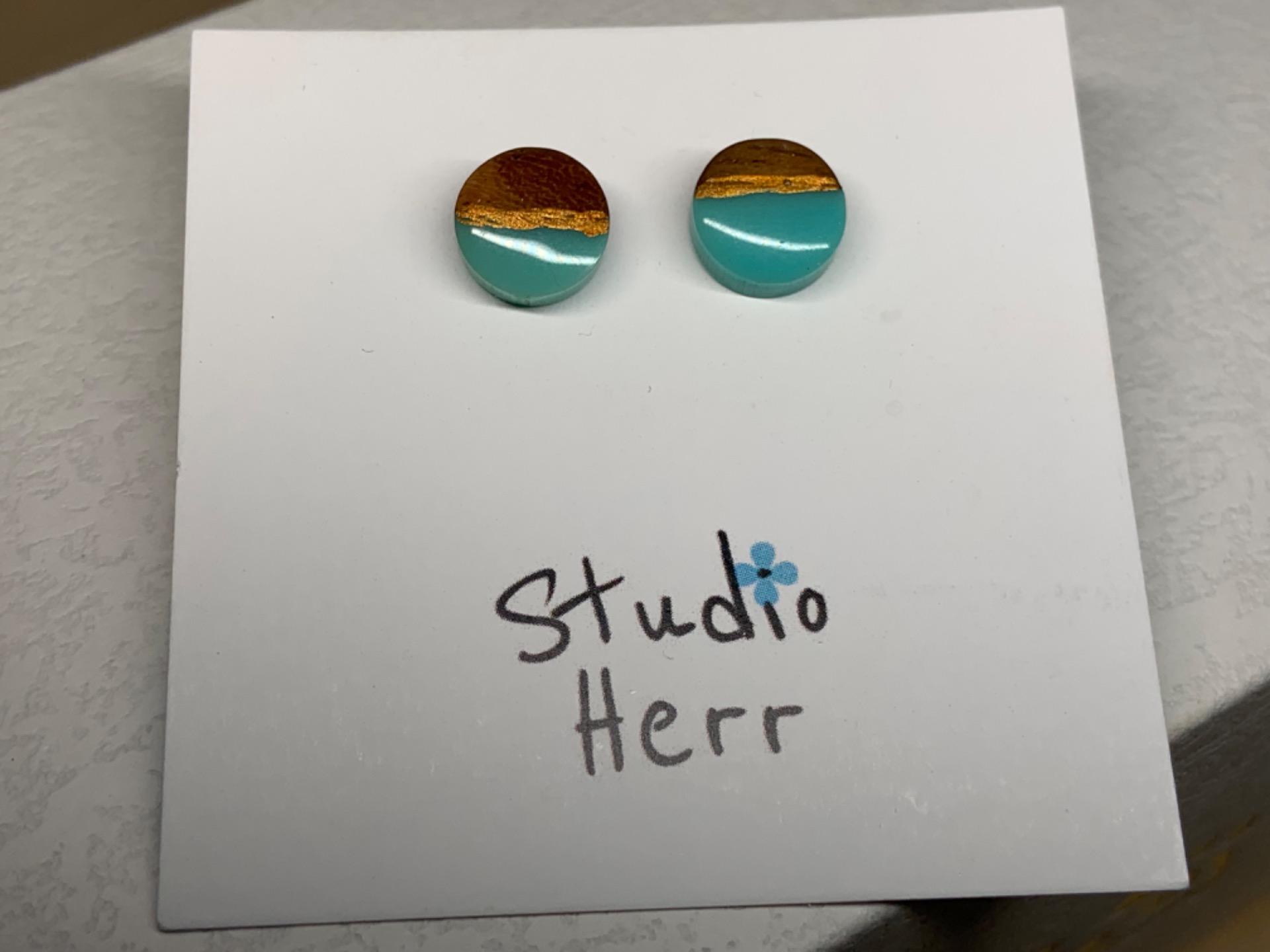 Deze massief houten korte oorbellen (notelaar) hebben aan de ene zijde een turkoois groene/blauwe hars. We hebben deze oorbellen afgewerkt met een glanzend koperen biesje tussenin.