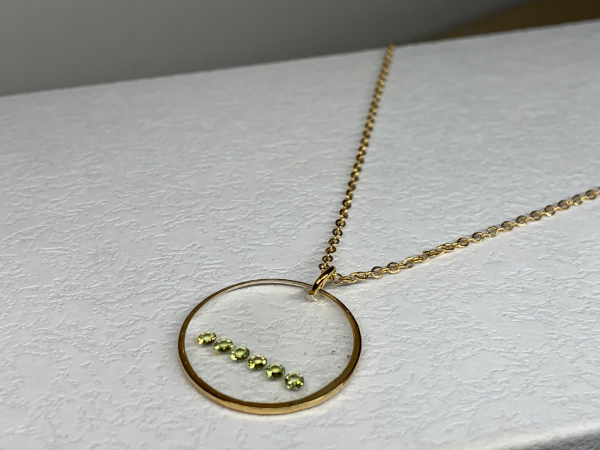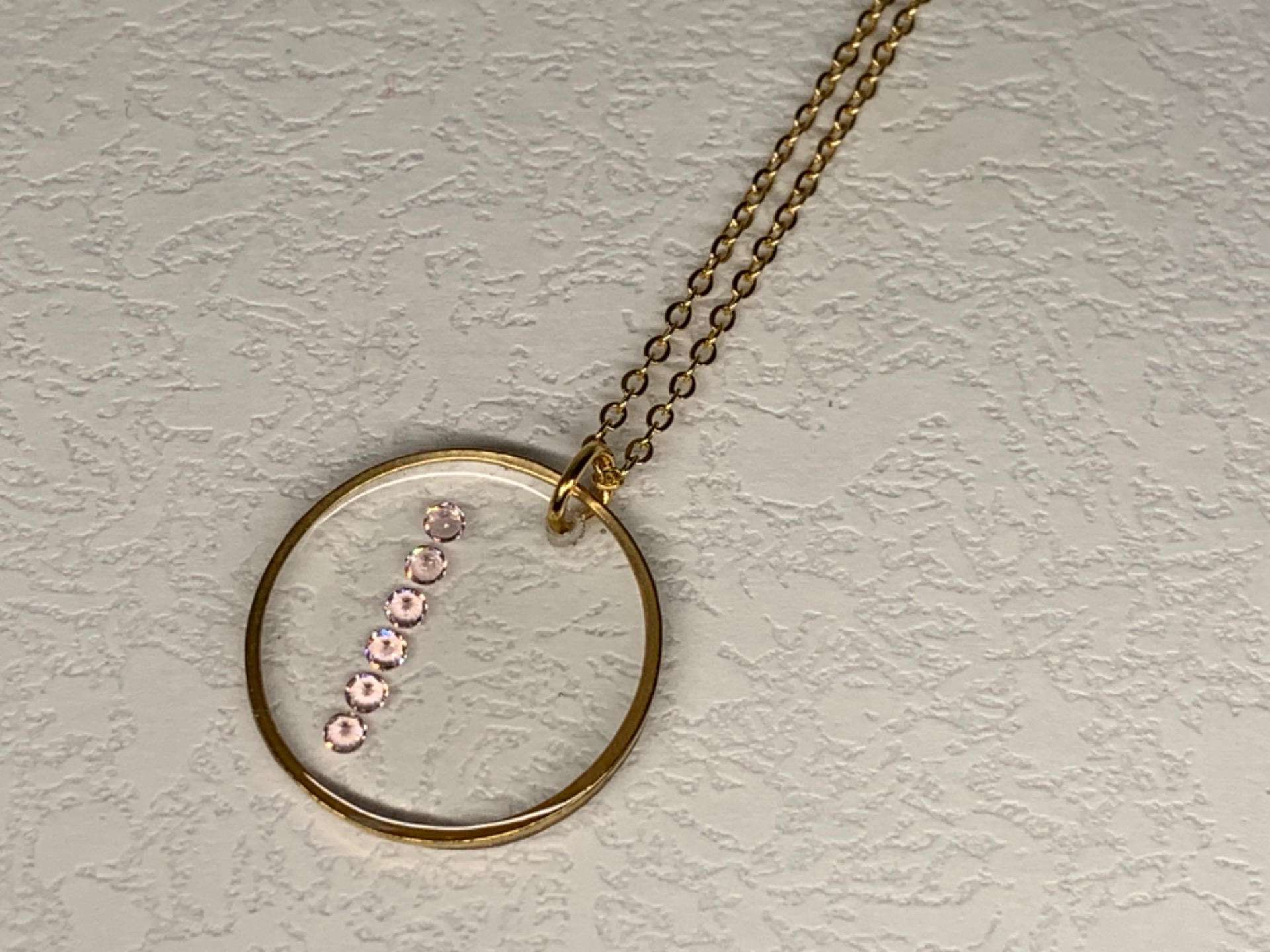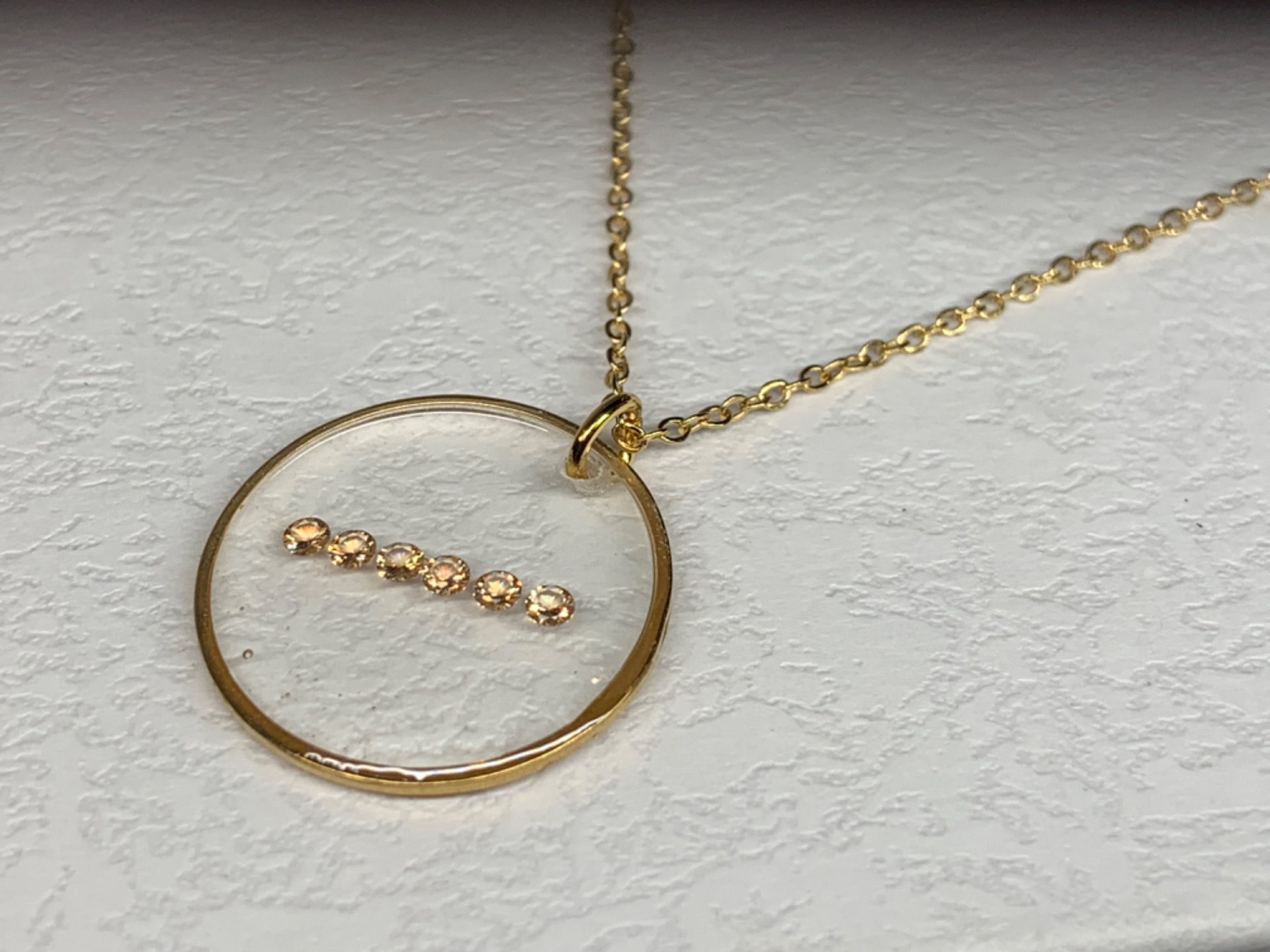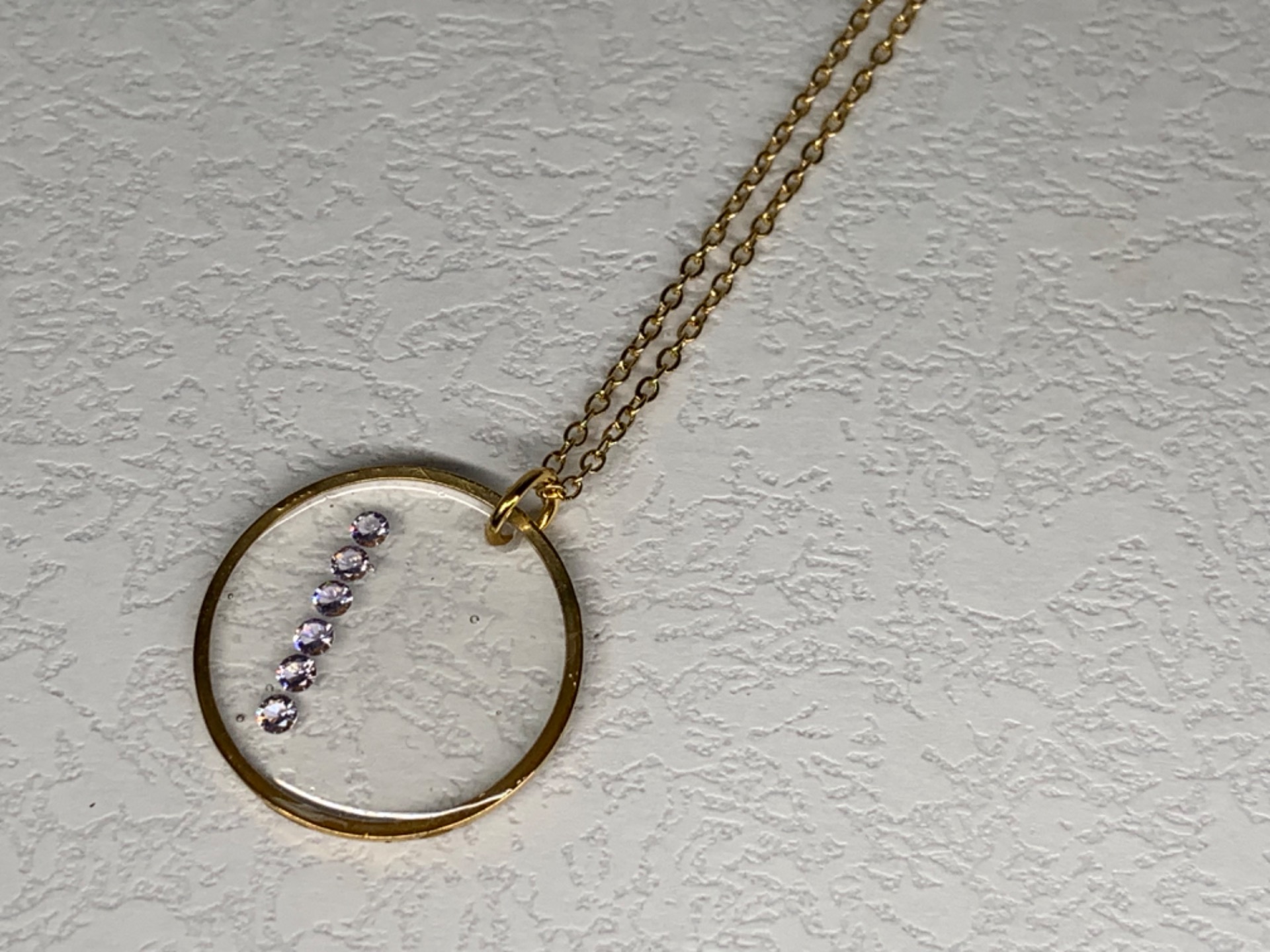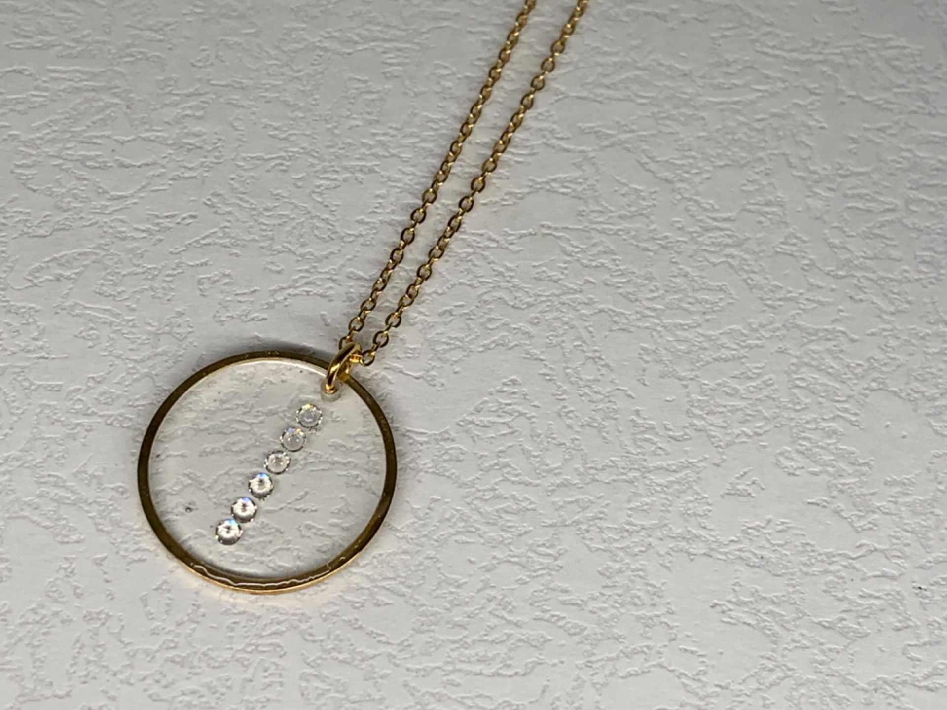 Een goudkleur rvs hanger met 6 strassteentjes op een rij.