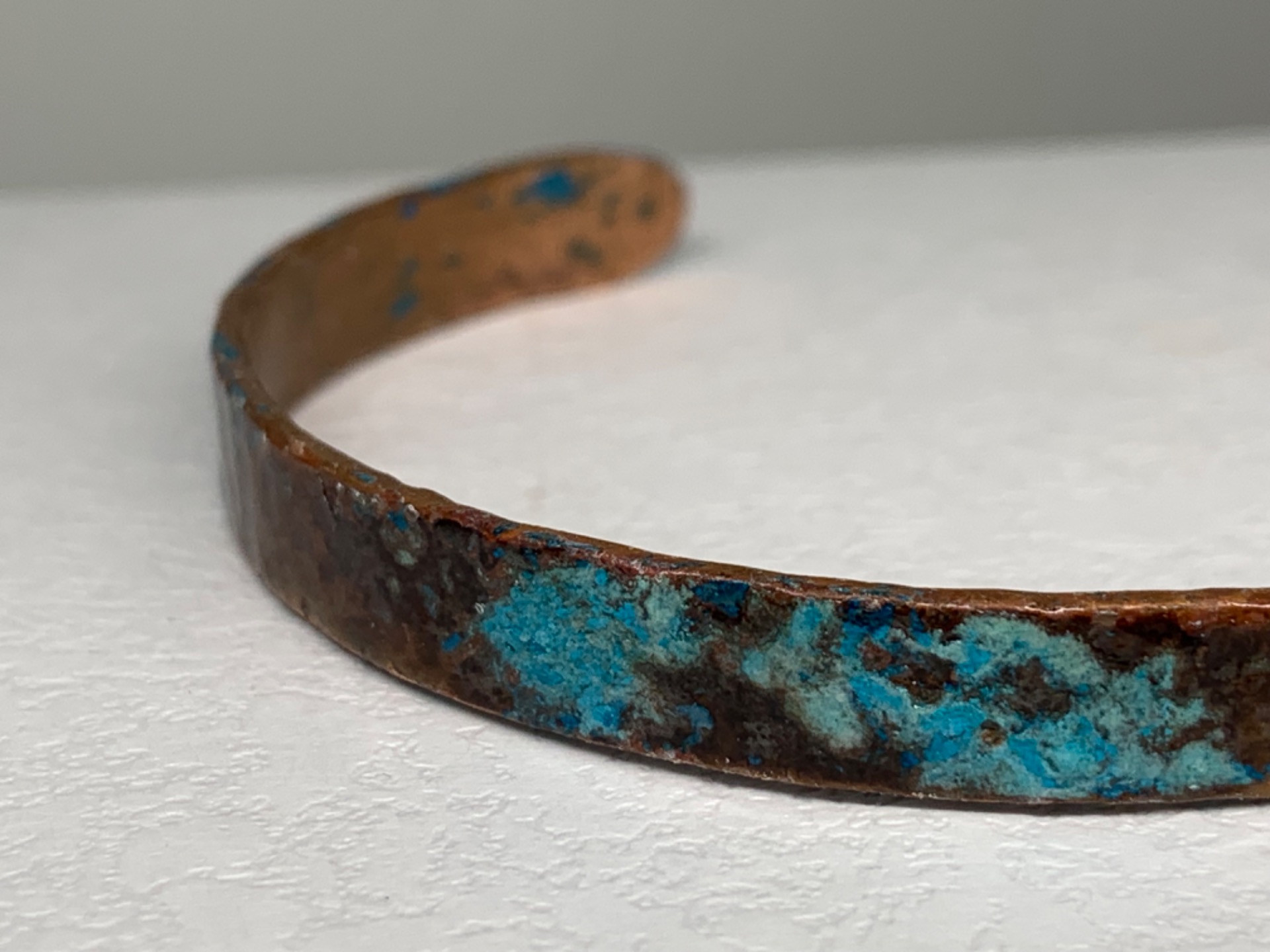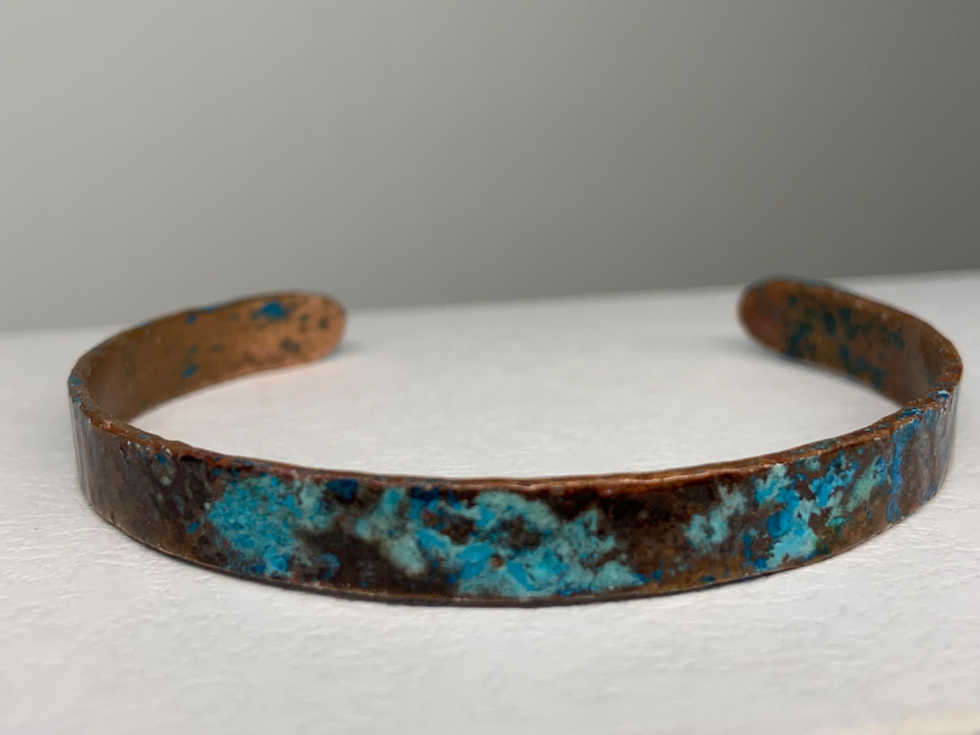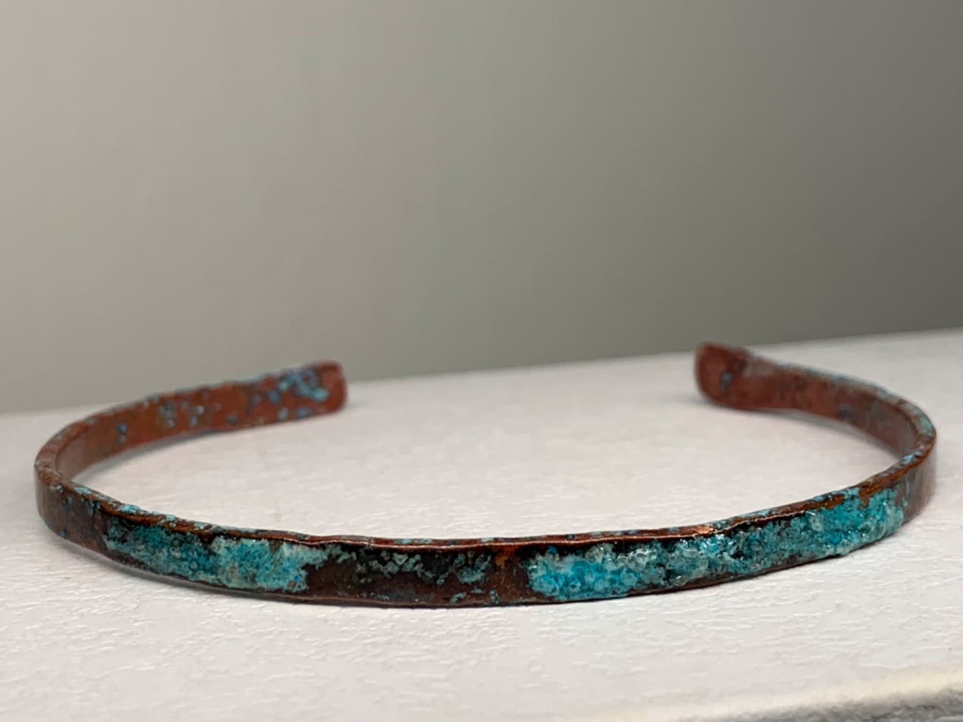 Massief koper met natuurlijke suikers en zouten bewerkt. Over dit geoxideerd proces brengen we een fijn laklaagje aan, zo blijft de finish mooi bewaard. Dankzij deze vernislaag zal je arm niet groen worden door het koper. Je kan ons vertellen of je een mat of shiny laklaag wil.Je kan kiezen tussen de versie van 3mm breed of 8mm breed.