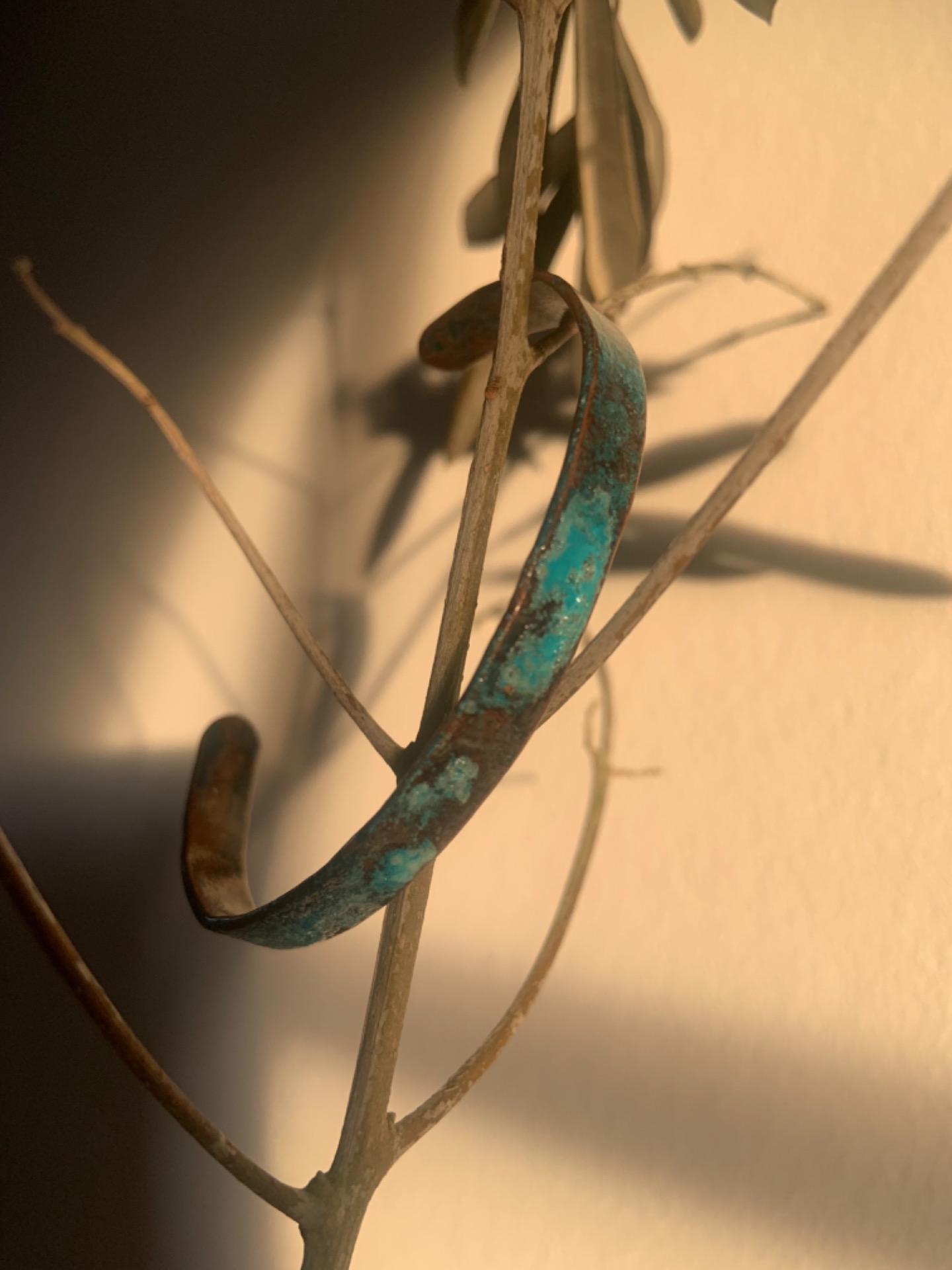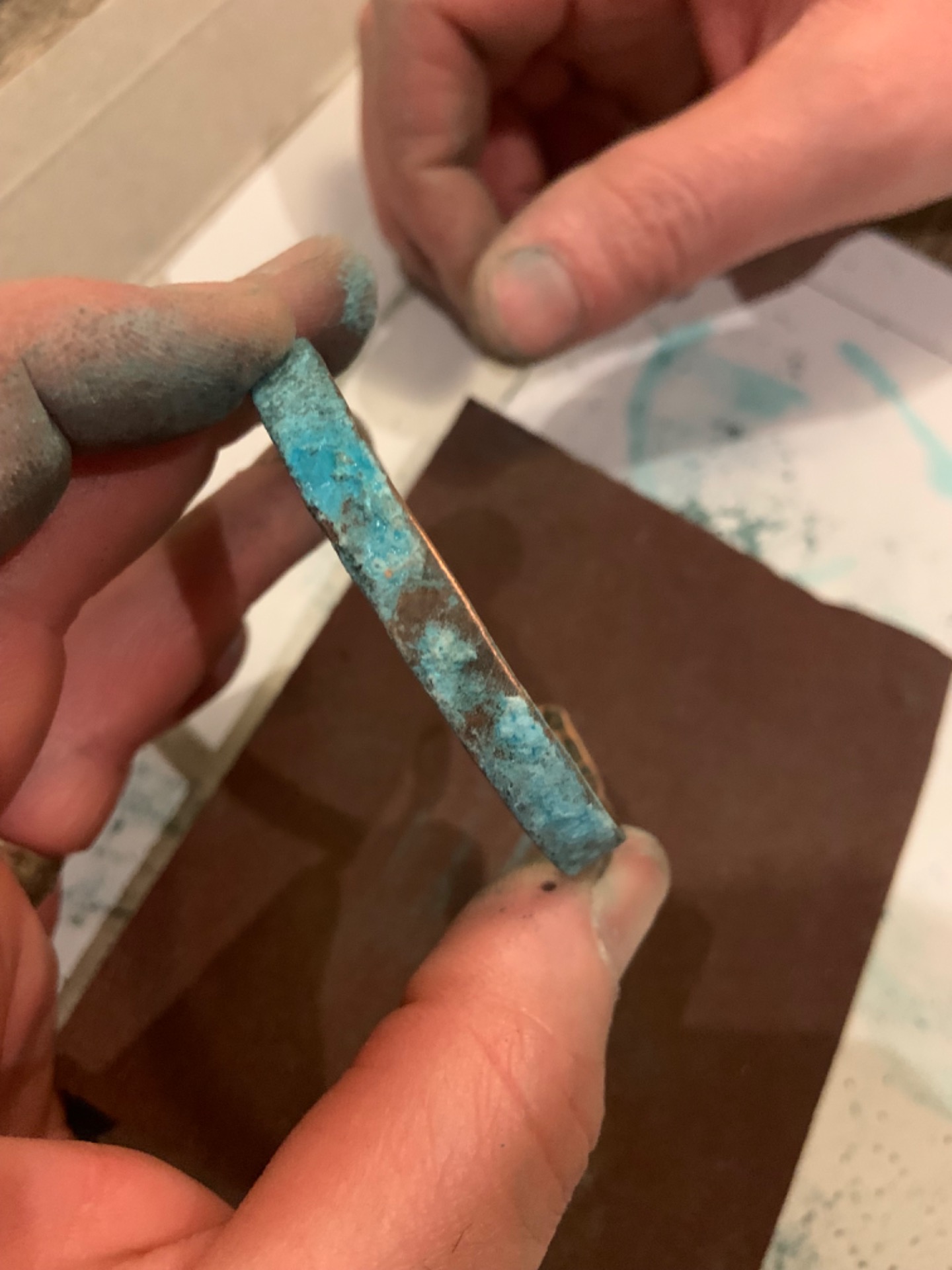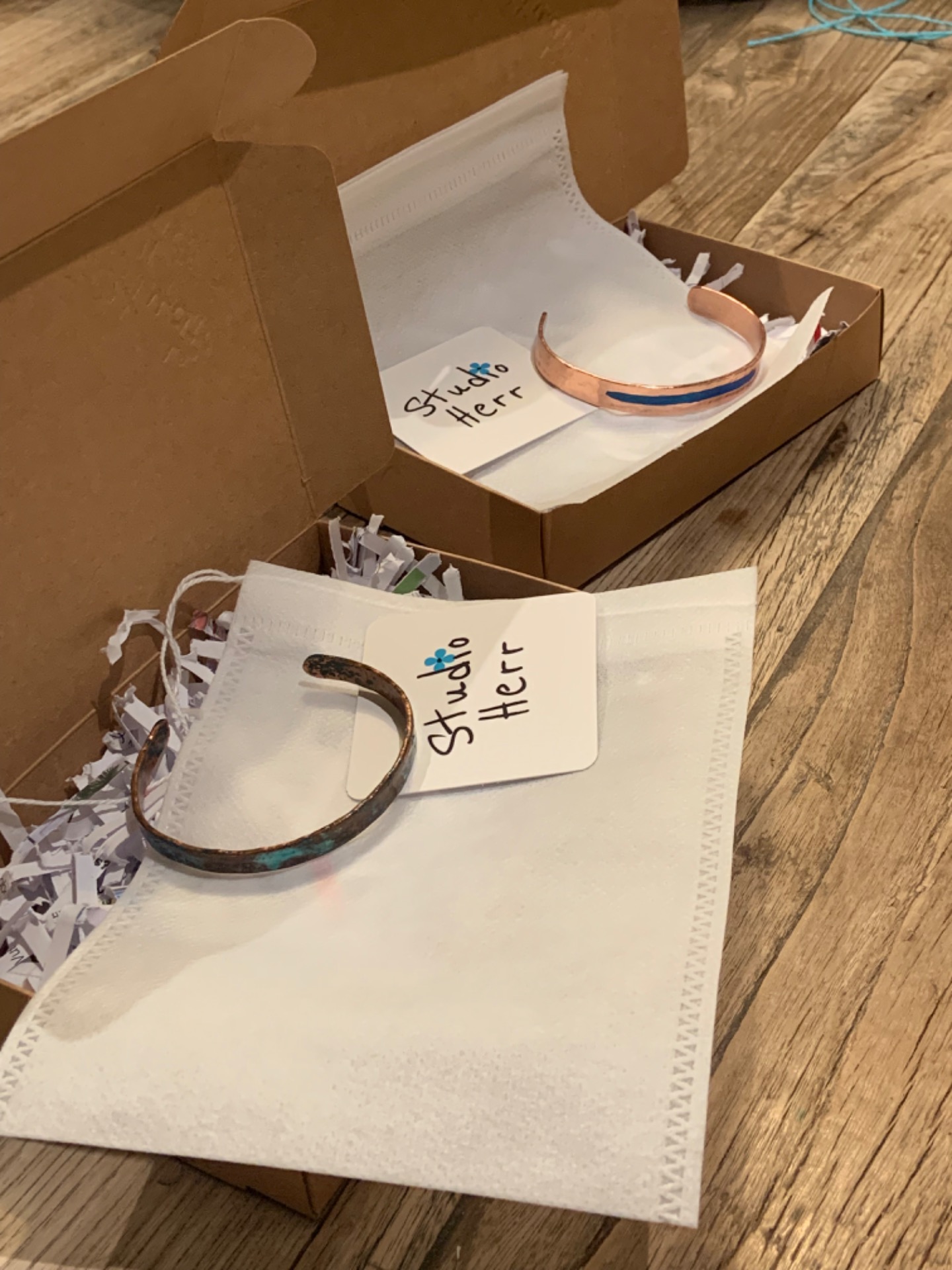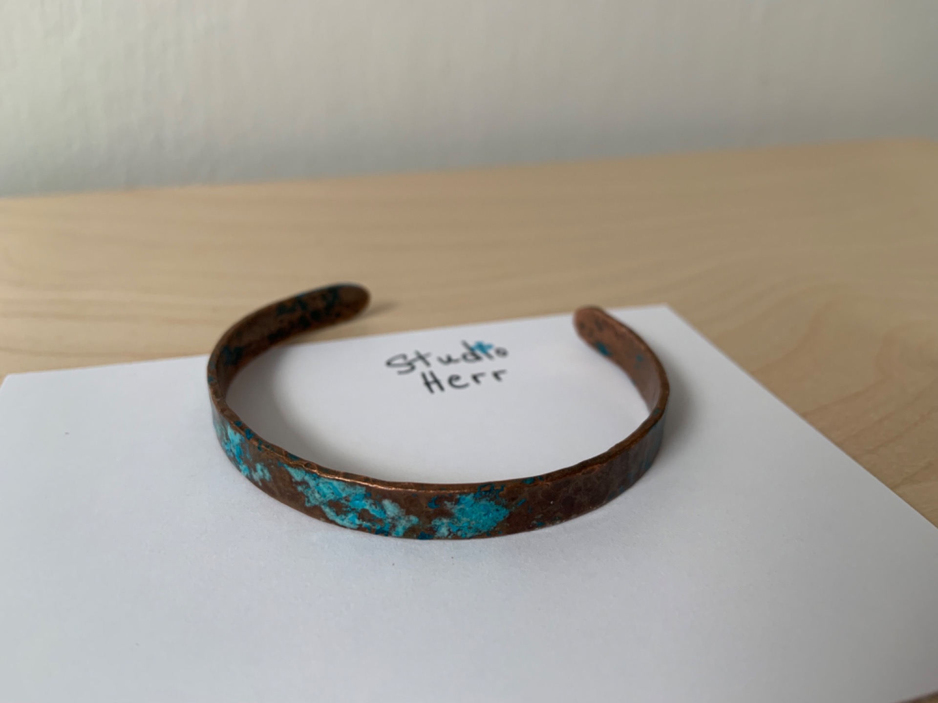 Massief koper met natuurlijke suikers en zouten bewerkt. Over dit geoxideerd proces brengen we een fijn laklaagje aan, zo blijft de finish mooi bewaard. Dankzij deze vernislaag zal je arm niet groen worden door het koper. Je kan ons vertellen of je een mat of shiny laklaag wil.Je kan kiezen tussen de versie van 3mm breed of 8mm breed.