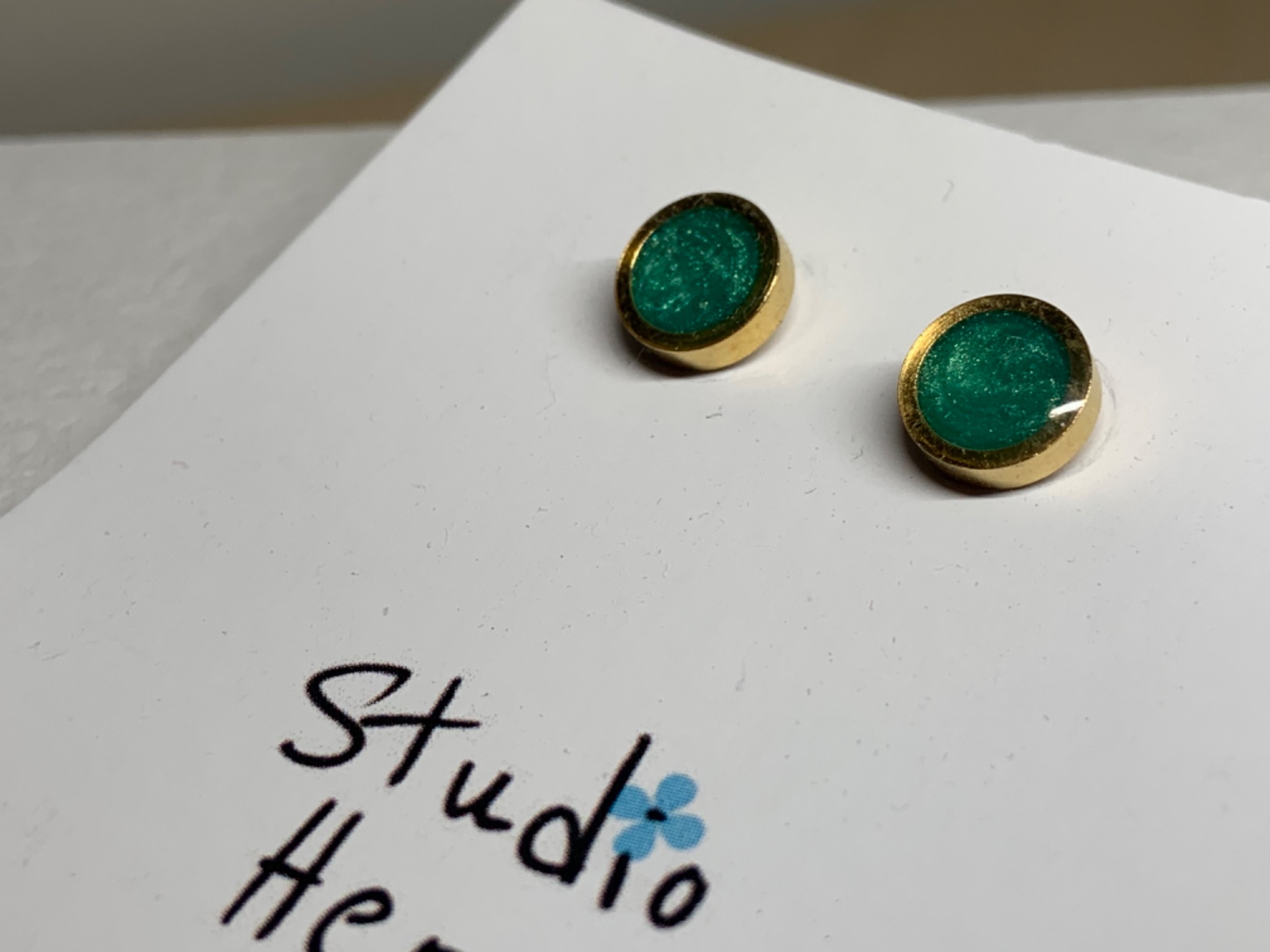 Ronde korte oorbellen met parelmoer groene vulling en goudkleurig randje. Wordt dit ook jouw favorietje?