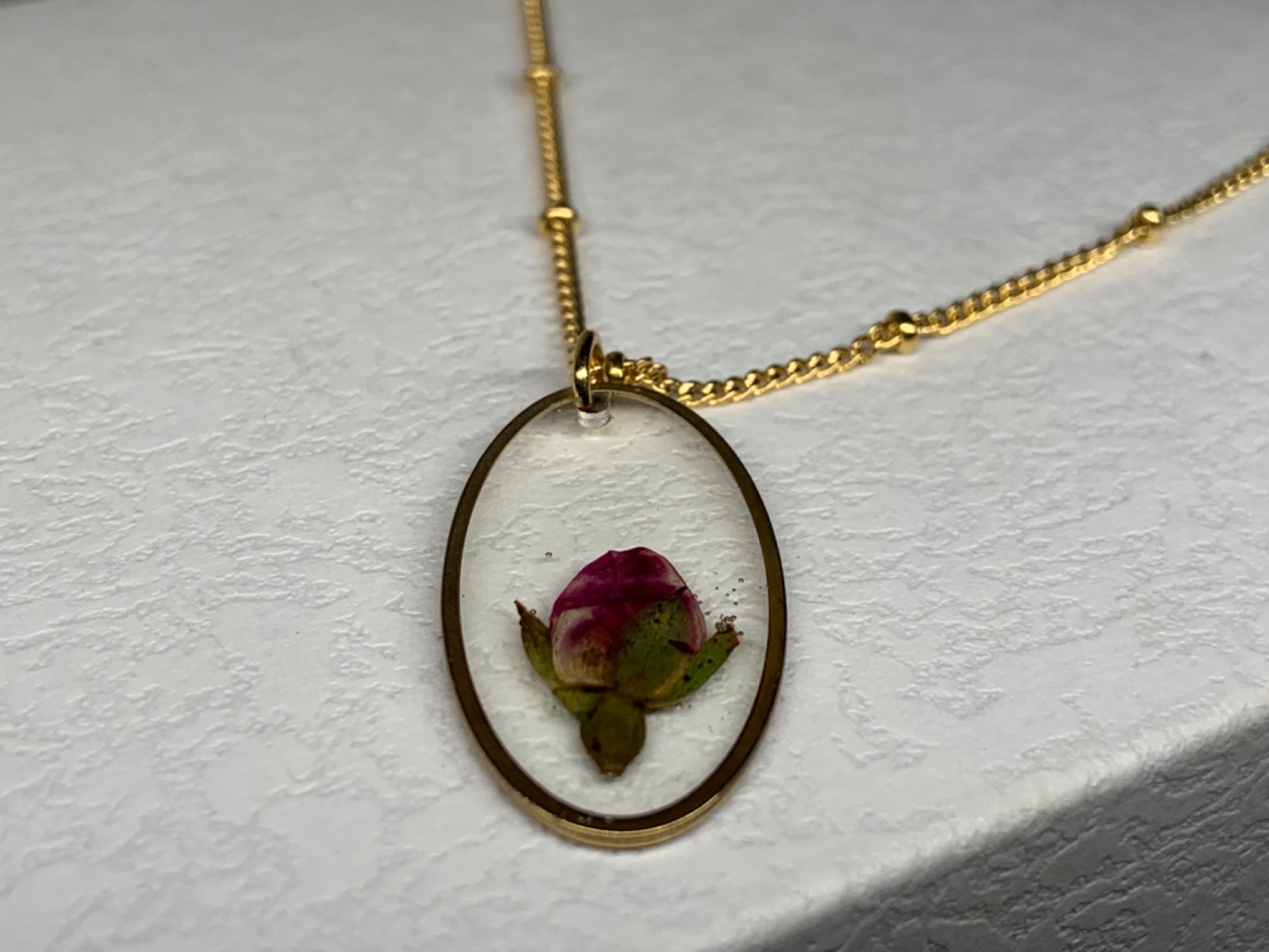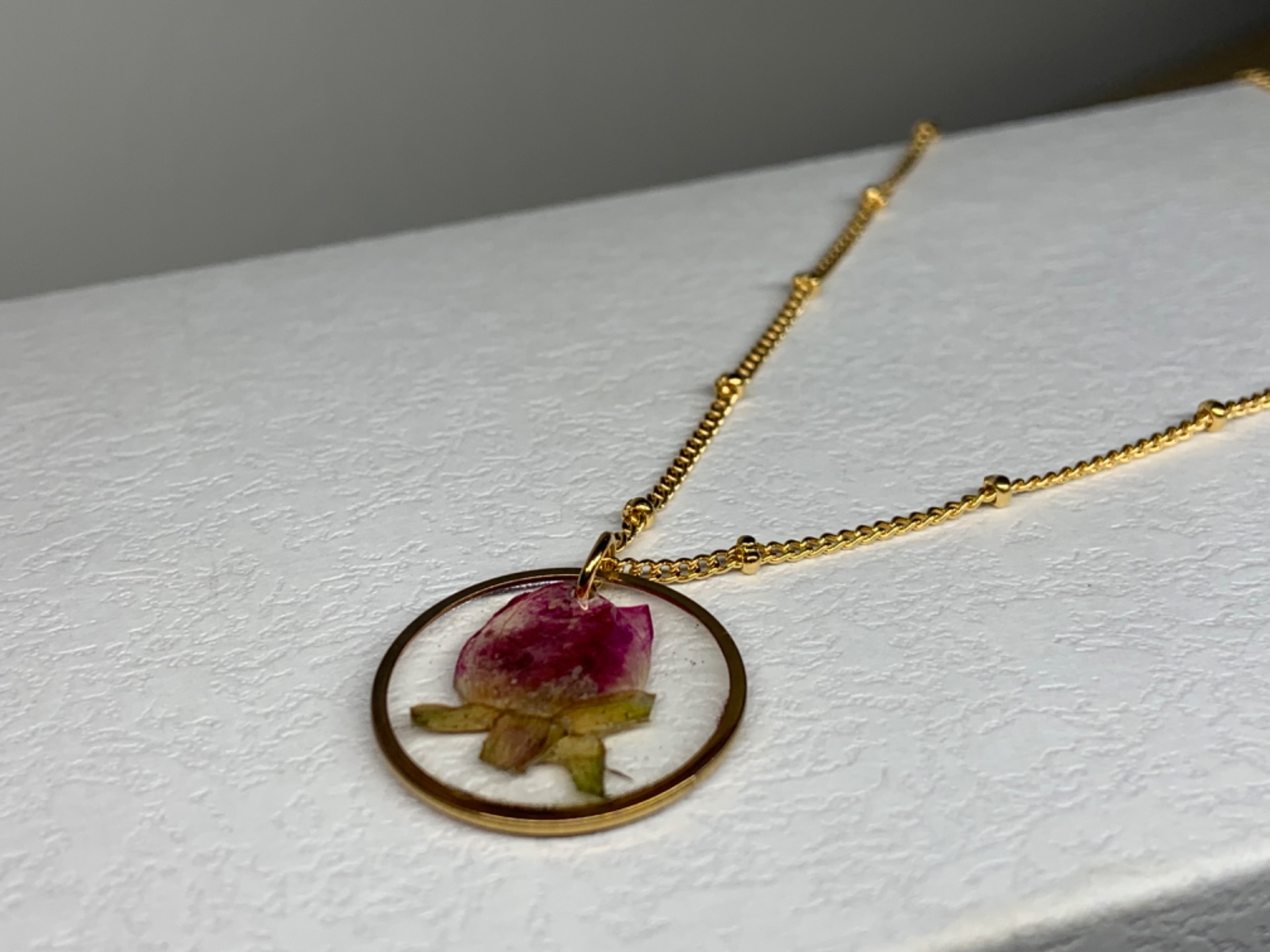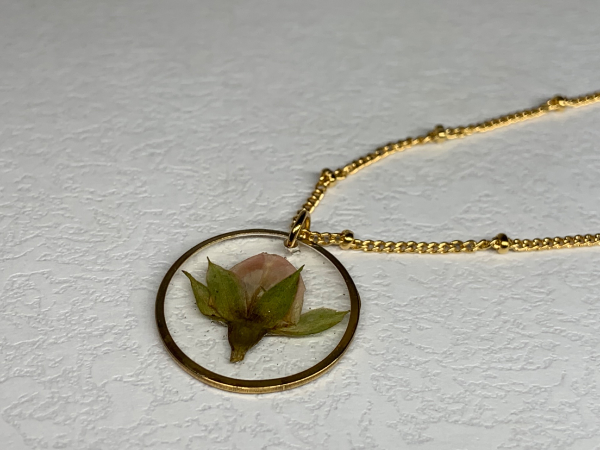 Hanger met mini gedroogd roosje, geplukt in Erembodegem.