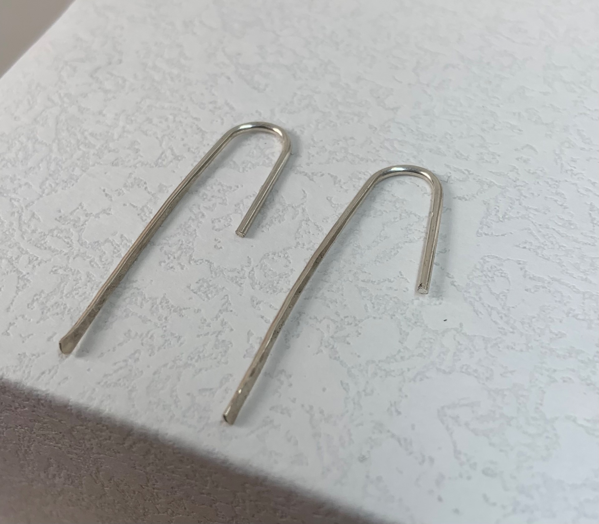 Elegante fijne zilveren oorbellen met lange voorzijde. Licht uitdeinende gehamerde onderkant.